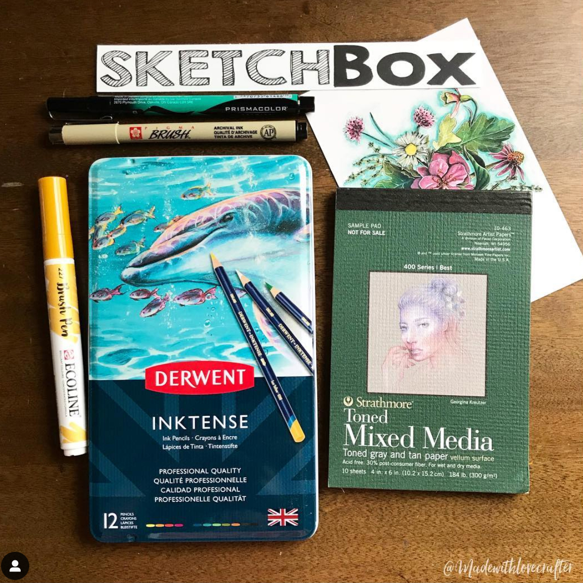 February is all about blending! This box includes a 12-set of Derwent Inktense colored pencils. These pencils can be used dry, rich, intense color or washed out with a little water to create a vivid translucent effect. We've also included an Ecoline liquid watercolor brush pen, a Sakura Pigma brush pen (staff favorite), a Prismacolor Premier brush pen, as well as a Strathmore toned mix-media pad. Photo by @lovelyreadergirl.