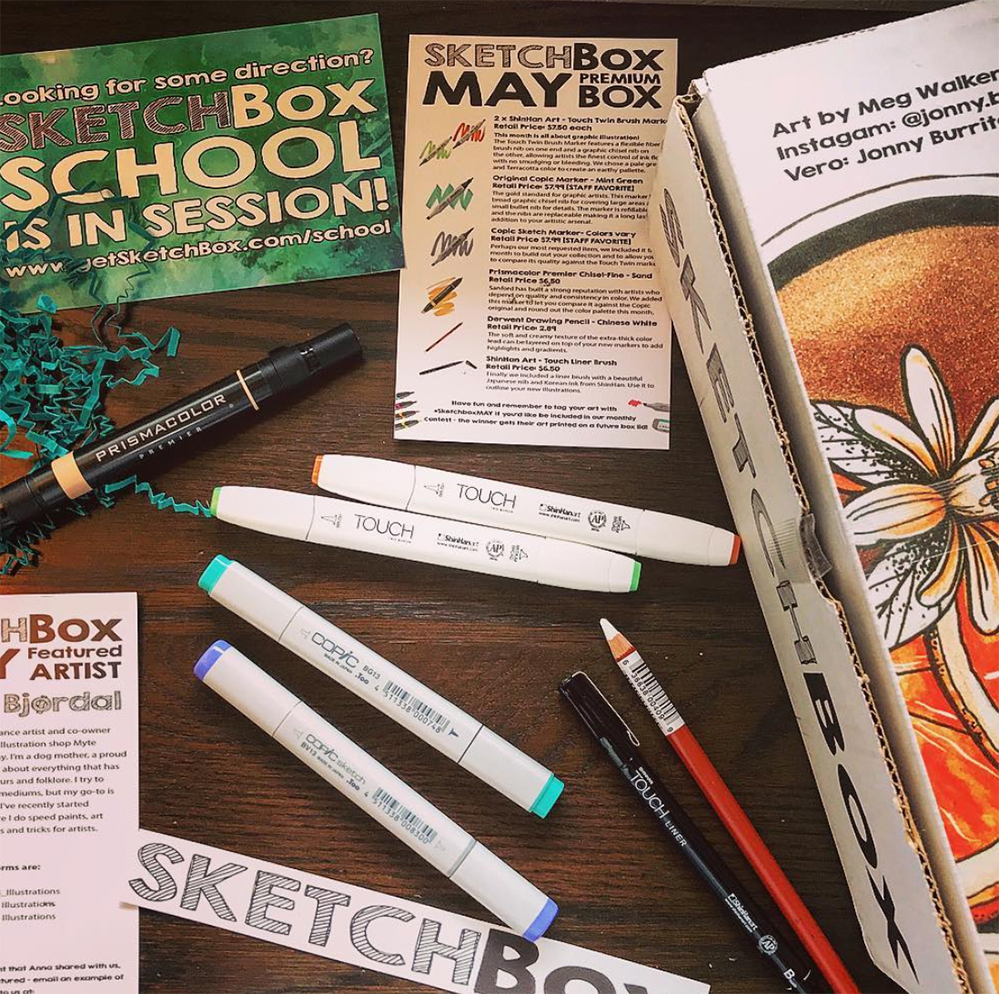 This month is all about graphic illustration! Our May 2018 Premium box includes two ShinHan Art Touch Twin brush markers in pale green and terracotta, an original COPIC marker in mint green, a COPIC Sketch marker (colors vary), a Prismacolor Premier dual-tip marker in sand, a ShinHan Art Touch Liner brush pen, and a Derwent drawing pencil in chinese white. Photo by the amazing @karma.go.
