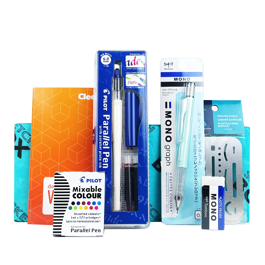 This month is all about technical drawing with a colorful twist! Our Basic Box features a 6mm Pilot Parallel Pen. Perfect for calligraphy or ink illustrations, this pen is versatile and long-lasting. We've also included the 12-color ink refill pack for this pen to allow you a wide variety of color options. Check out this month's instructional video for tips and tricks on how to get the most out of this unique item (video link below). This box also includes a Tombow Mechanical Pencil that's perfect for sketching or refining a concept. Need a little help with straight lines and fundamental shapes? Use the Art Alternatives Erasing Shield from this month's box as a ruler or in combination with the included Tombow Mono Eraser to pull out details from your sketch. Finally, our surface this month is a pad of ClearPrint Design Vellum (4x6", 50 sheets). Vellum is a designer's best friend. Draft sketches and refine your concept with this transparent paper. The ink block panel on this pad protects against bleed-through from a variety of mediums.