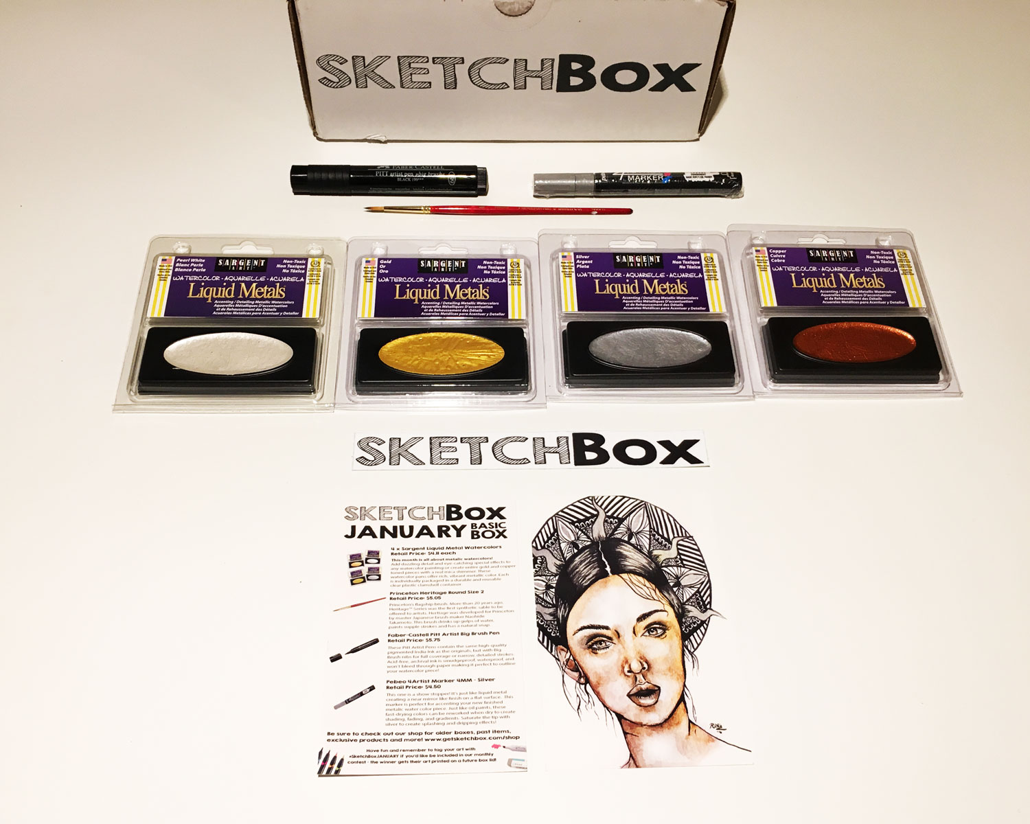 Our January 2017 basic box focused on metallic watercolors. It included 4 Sargent Liquid Metal Watercolors, a Princeton Heritage series round brush size 3, a silver Pebeo 4Artist Marker 4MM, and a Faber-Castell Pitt Artist Big Brush Pen. Add dazzling detail and eye-catching special effects to any watercolor painting or create entire gold and copper toned pieces with a real mica shimmer. These watercolor pans offer rich, vibrant metallic color. The Heritage Series was the first synthetic sable brush to be offered to artists. Hertiage was developed for Princeton by master Japanese brush-maker Naohide Takamoto. This brush drinks up gulps of water, paints supple strokes and has a natural snap. The Faber-Castell Pitt artist big brush pens contain the same high-quality pigmented India Ink as the originals, but with big brush nibs for full coverage or narrow, detailed strokes. The acid-free, archival ink is smudgeproof, waterproof, and won't bleed through paper making it perfect to outline your watercolor piece! Finally we included a Pebeo 4Artist 4MM marker in silver. This one is a show stopper! It’s just like liquid metal creating a near mirror like finish on a flat surface. This marker is perfect for accenting your new finished metallic water color piece. Just like oil paints, these fast-drying colors can be reworked when dry to create shading, fading, and gradients. Saturate the tip with silver to create splashing and dripping effects!